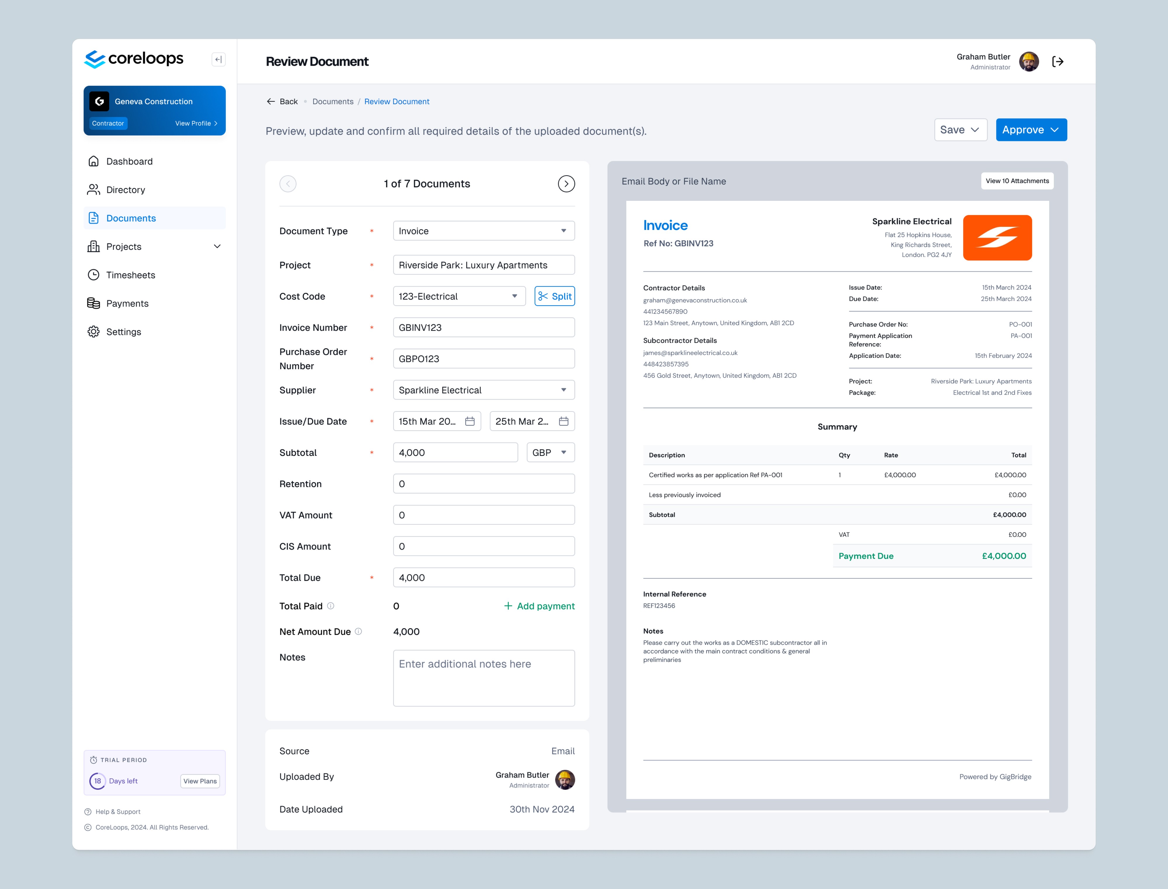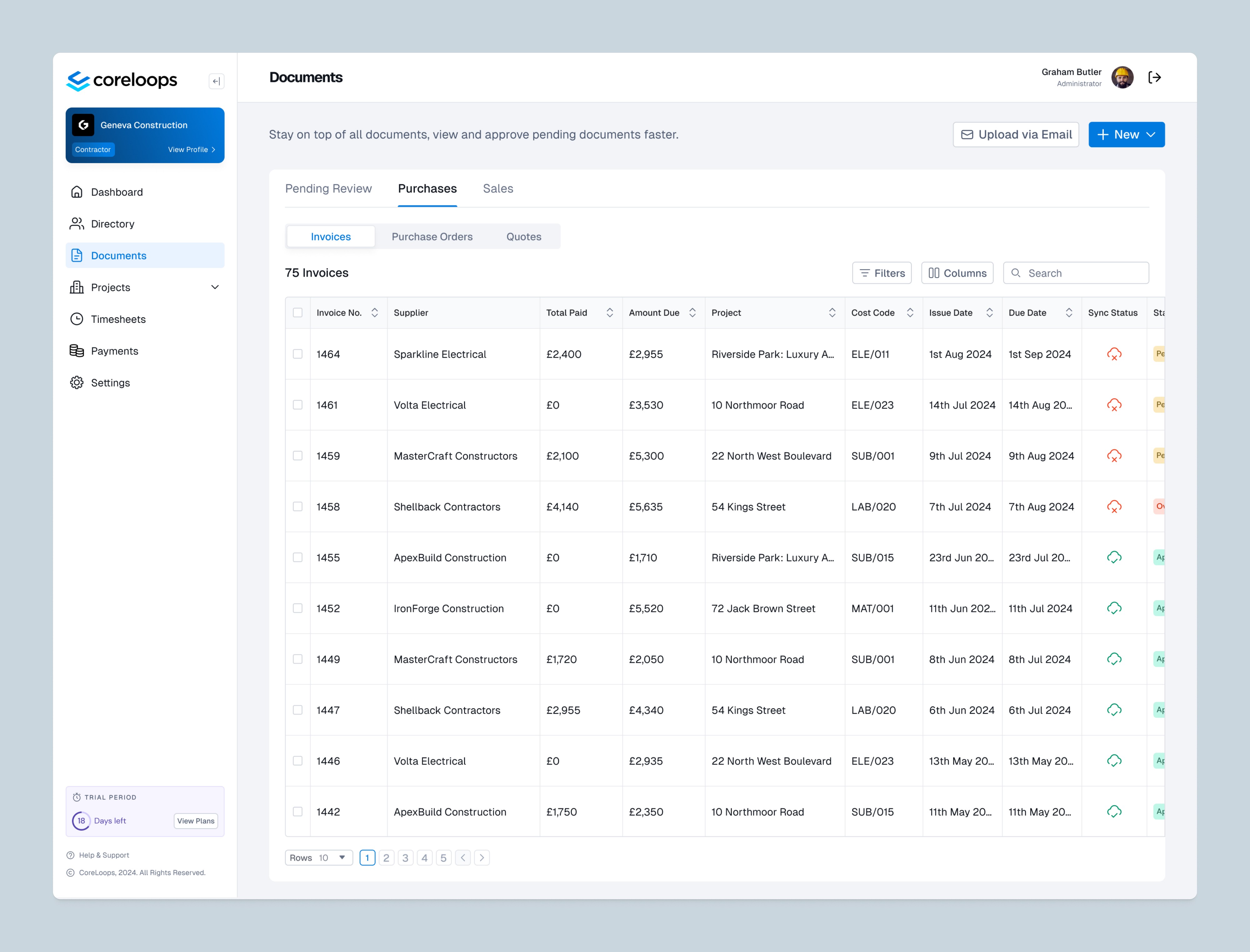 The Documents Manager was another key value driver and USP. It began as a central place for reviewing cost documents like invoices, POs, and quotes, helping contractors organize what was previously scattered across email and paper. Over time, it evolved into a powerful document processing, storage and creation tool.