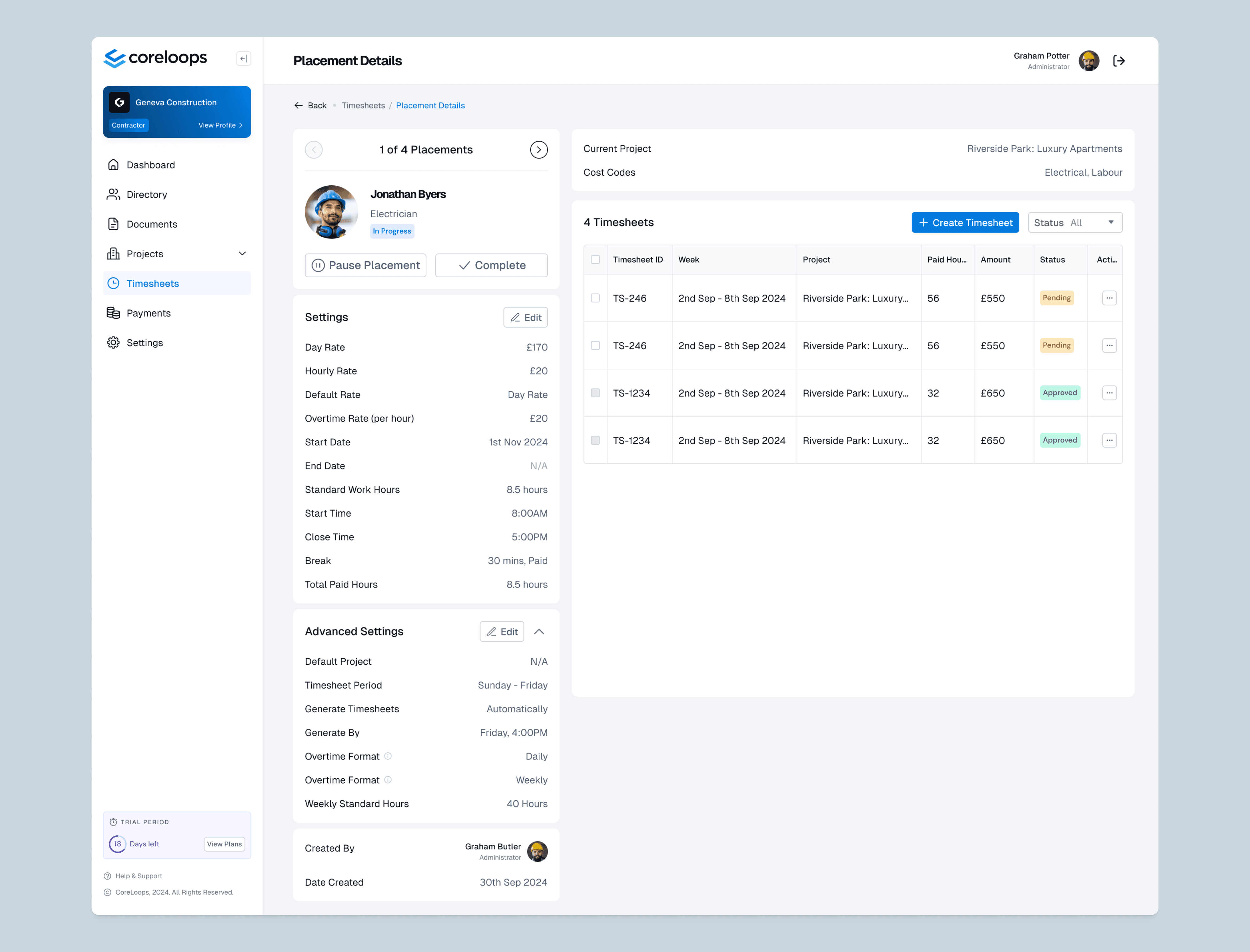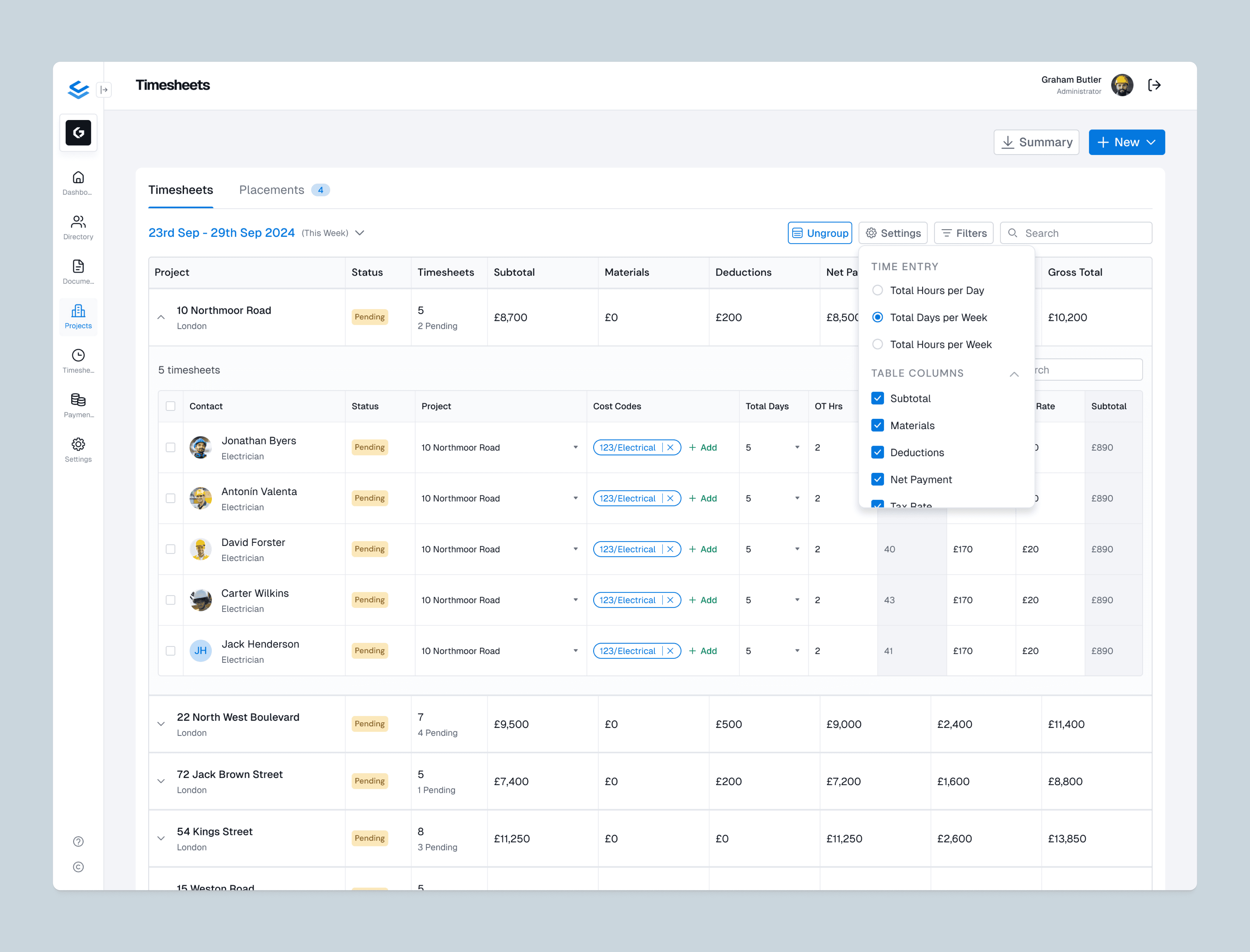 Introduced 'Placements' to store worker details per project such as pay rate, overtime rate etc. This way the accounting team only needed to set this once and it was applied across every week of the project.