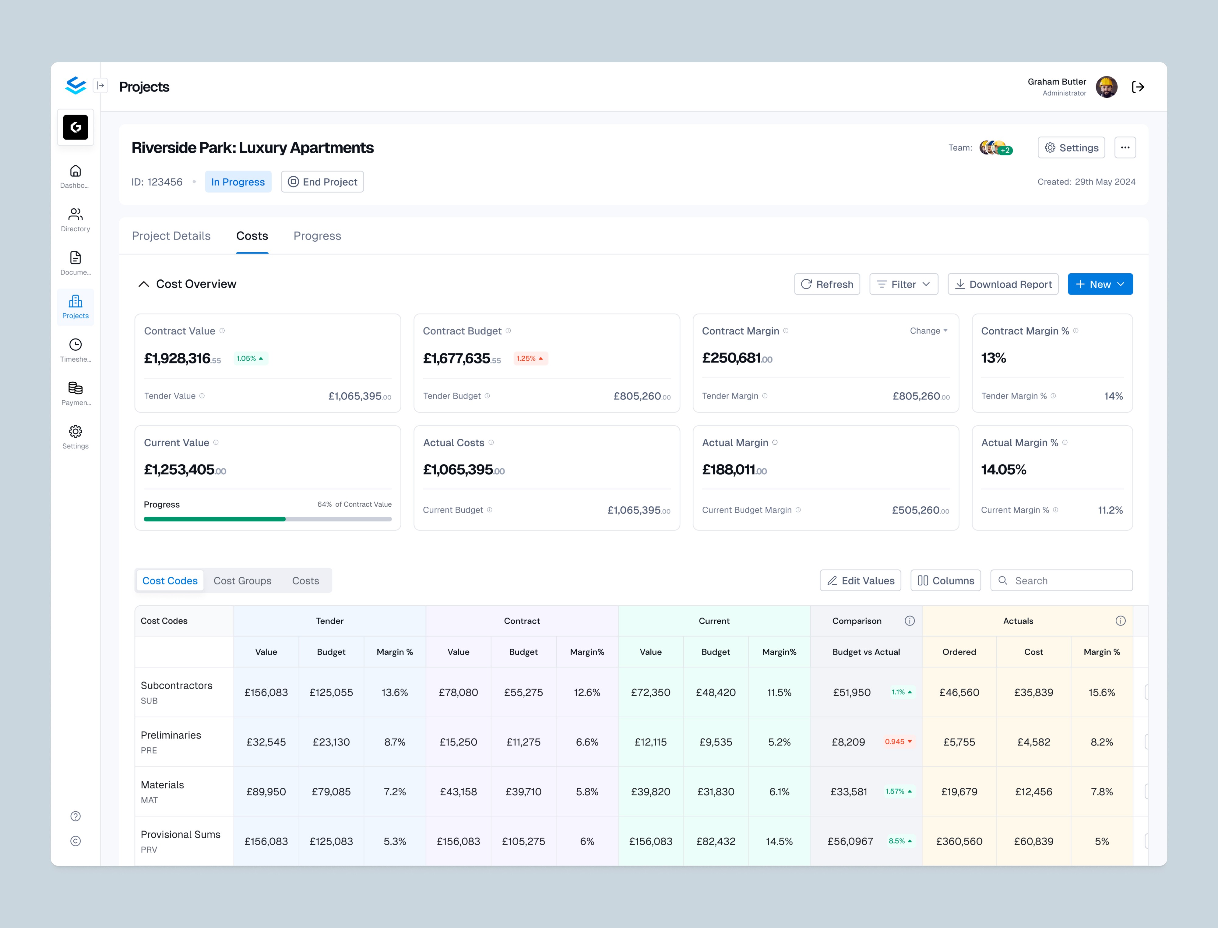 We introduced cost tagging to relevant cost codes (categories), allowing users to break down total spend by sections of the project. e.g Electrical, Plumbing etc.