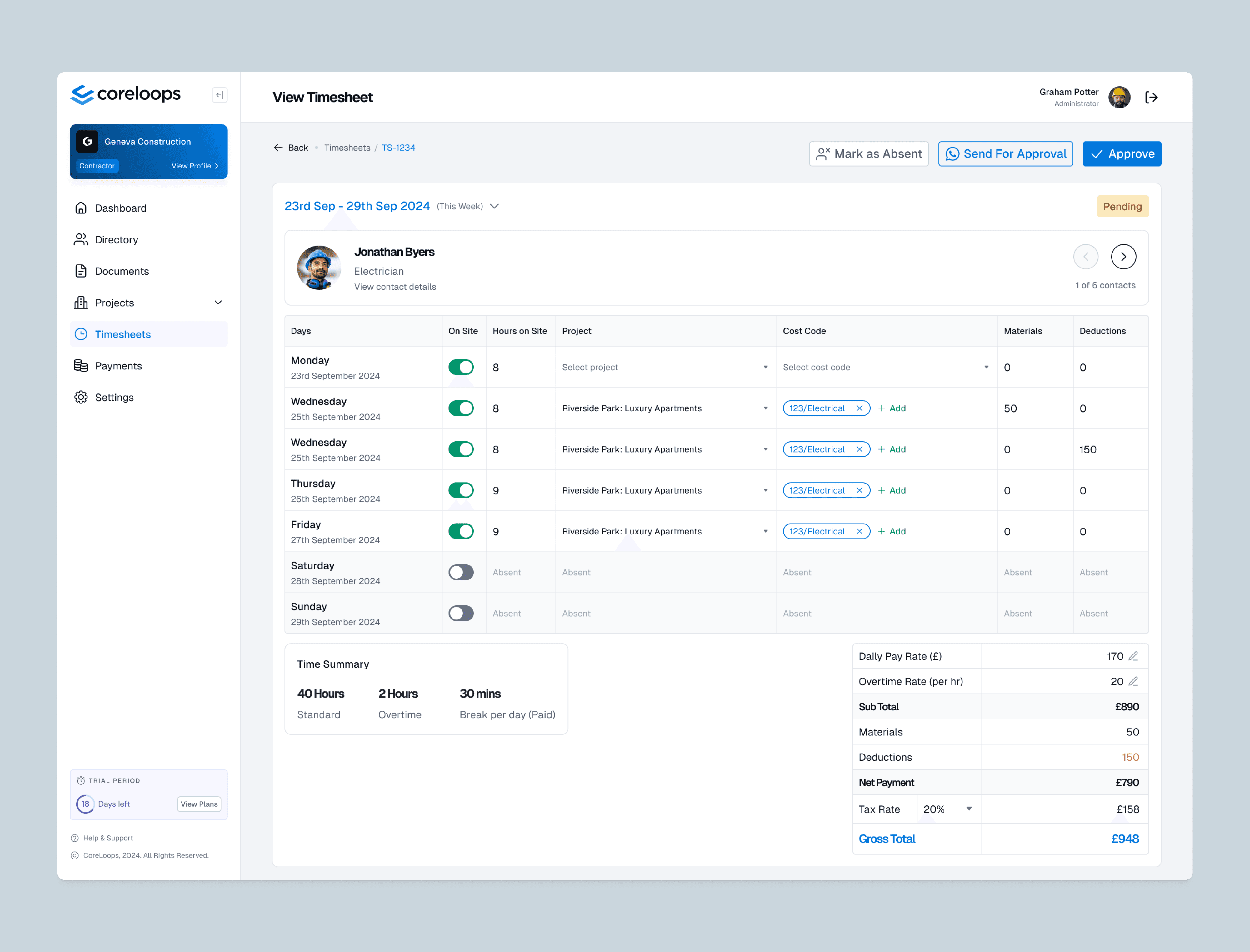We first introduced it during the GigBridge marketplace era to help contractors and workers track and settle on attendance and hours which was in turn used to calculate and process payments. As we transitioned into Coreloops, we redesigned it to fit cost reporting needs, turning timesheet data into financial data that fed into the cost reports dashboard.