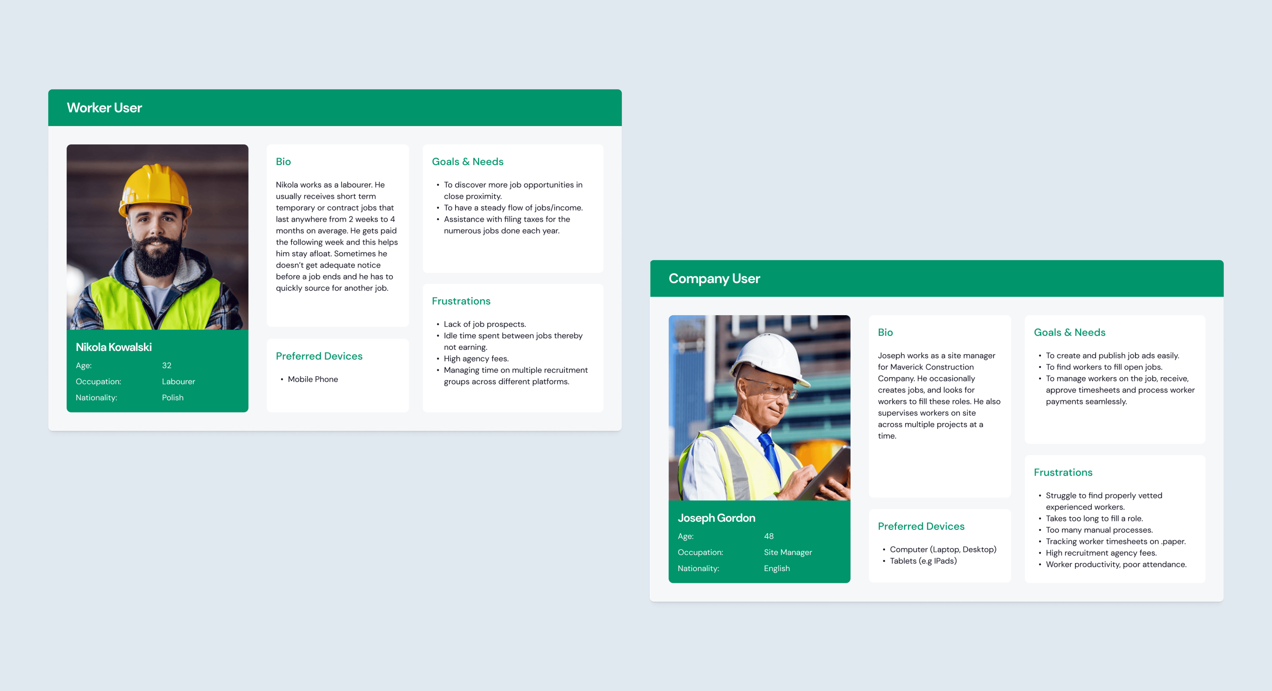 User persona overhaul: Transitioned from jobseekers and site managers to commercial managers, finance teams, and directors.